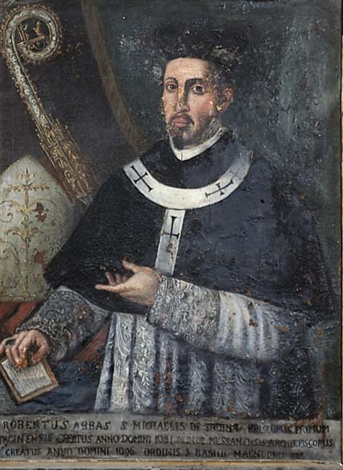 convento San Michele Arcangelo Il principale sforzo costruttivo fu riservato, tuttavia, alla prima Cattedrale normanna di Sicilia; eretta tra il 1066 e il 1070, secondo la tipologia delle cattedrali fortezza, risultò opera di sintesi culturale di maestranze bizantine, arabe e normanne. La cattedrale di Troina, denominata "Primogenita e Prediletta" in tutti i diplomi, fu dedicata alla Santa Vergine Assunta e dotata di vaste rendite. Nel 1082, il Conte ripristinò il vescovado e vi pose a capo il cognato Roberto, già abate del cenobio di San Michele Arcangelo. Fu un atto assolutamente in contrasto con la normale prassi canonica, ma Gregorio Settimo, che non poteva inimicarsi gli Altavilla, fu costretto, suo malgrado, ad ammettere la deroga. Nel 1088 Ruggero ospitò a Troina il Papa Urbano II che volle incontrarsi con il Conte per assicurarsi laiuto militare necessario a sopraffare lantipapa Clemente III. In quelloccasione pare si raggiunsero i primi accordi sulla "Legatia Apostolica", perfezionati ufficialmente a Salerno nel 1098. Con tale privilegio il Papa riconobbe a Ruggero, e ai suoi successori, il titolo di Legato Pontificio in Sicilia con la facoltà di designare i vescovi isolani e di fissare i confini delle loro diocesi. A ricordo della storica visita del pontefice, si conserva ancora oggi nellOratorio del SS. Sacramento o dei Bianchi di Troina la predella dellaltare su cui Urbano II celebrò la S. Messa. Tela raffigurante Roberto, abate del cenobio di San Michele e cognato del Conte Ruggero Nonostante il trasferimento del vescovado a Messina (1096), Troina rimase fino al XVIII secolo un importante centro religioso. Vi si contavano trenta chiese e dodici monasteri. Troina fu sempre città demaniale, fatta eccezione per due brevi periodi sotto gli Aragona. Era la decima città demaniale dellisola, occupava il XIII posto nel parlamento siciliano, aveva il Regio Castello di Città presieduto dal Capitano del Popolo e proprie milizie con vessillo municipale. |